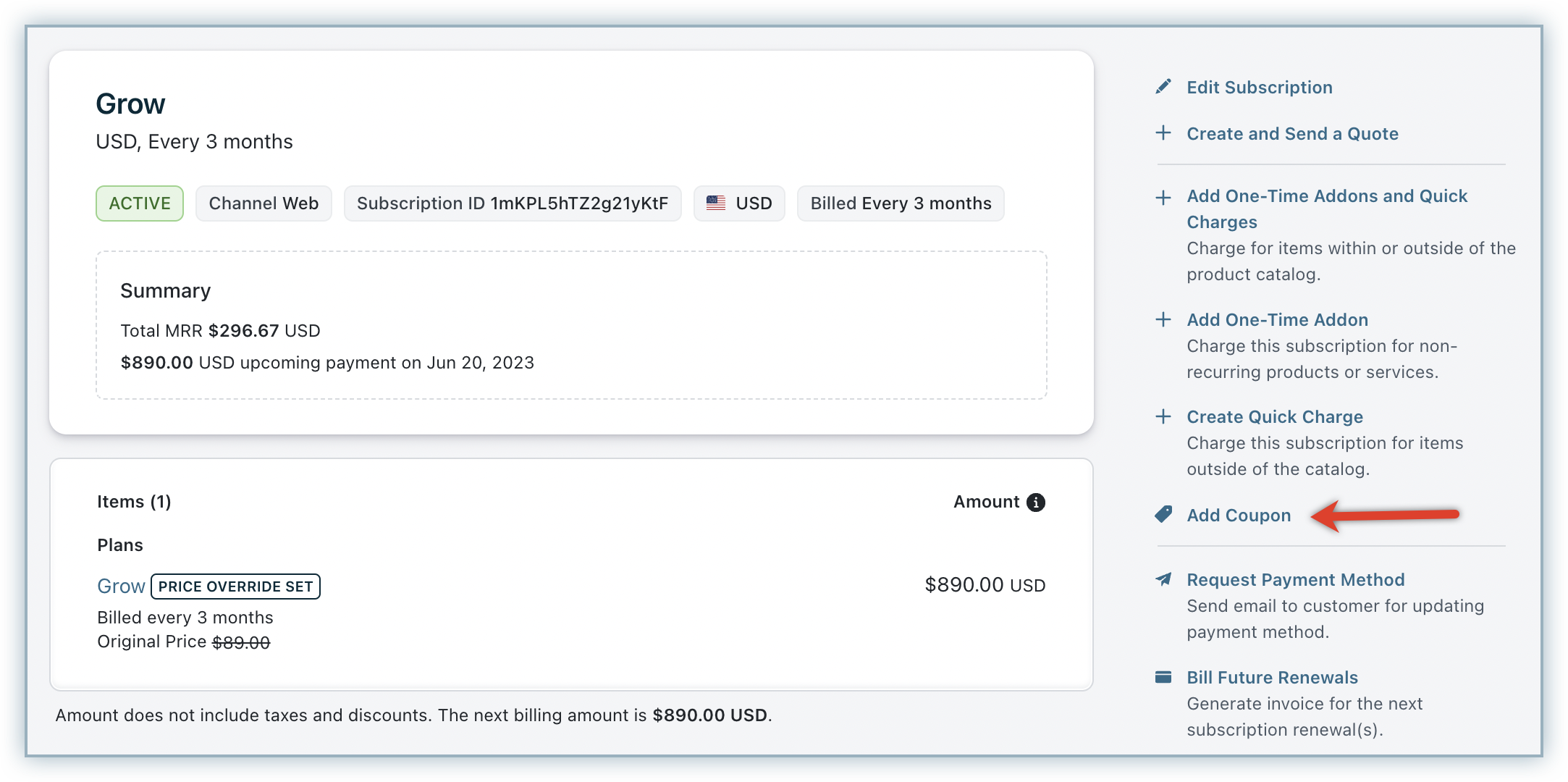 - Adding the coupon/coupon code to the subscription: If you're adding the coupon or coupon code for the customer at any point in the billing cycle, navigate to the respective subscription and click Add Coupon to add the coupon or coupon code.
