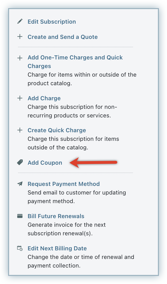If you're adding the coupon/coupon code for the customer, at any point of time in the billing cycle, navigate to the respective Subscription and find the Add Coupon option on the Action Panel.