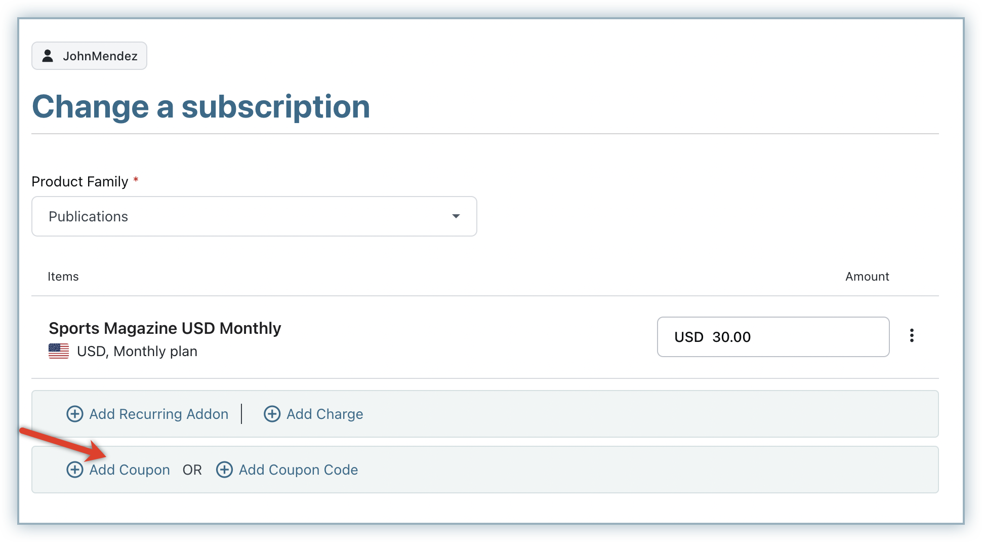 If you're applying the coupon on your Customer's behalf during a Subscription change, you will find the option in the Change Subscription page.