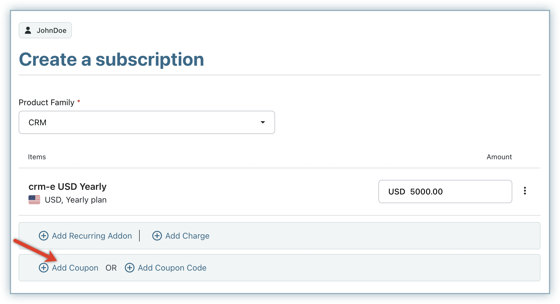 If you are adding a coupon/coupon code on behalf of your Customer while creating a new Subscription for them, navigate to Subscription Info section in the ‘Create Subscription' page, select a plan using Add Plan and you will find the option to Add Coupon/Coupon Code.