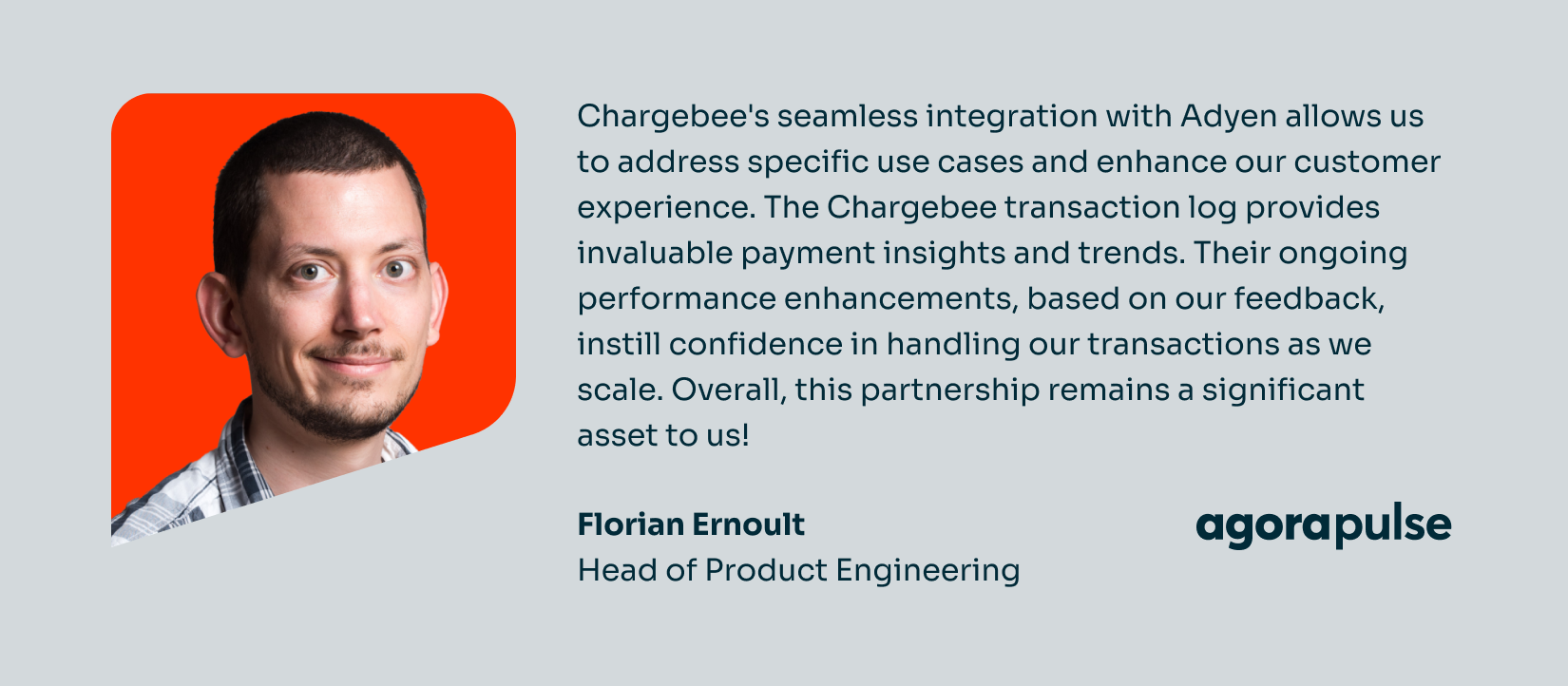 "At this time, I was starting to build the team that'll later handle subscription management internally. Hence, I had to do most of the research myself. I ended up implementing two proof of concept, one being Chargebee. What I most appreciated about Chargebee at the very beginning was the ease of implementation and the simplicity of the interface," Florian Ernoult, Head of Product Engineering at Agorapulse, recalls about his first taste of the Chargebee platform.