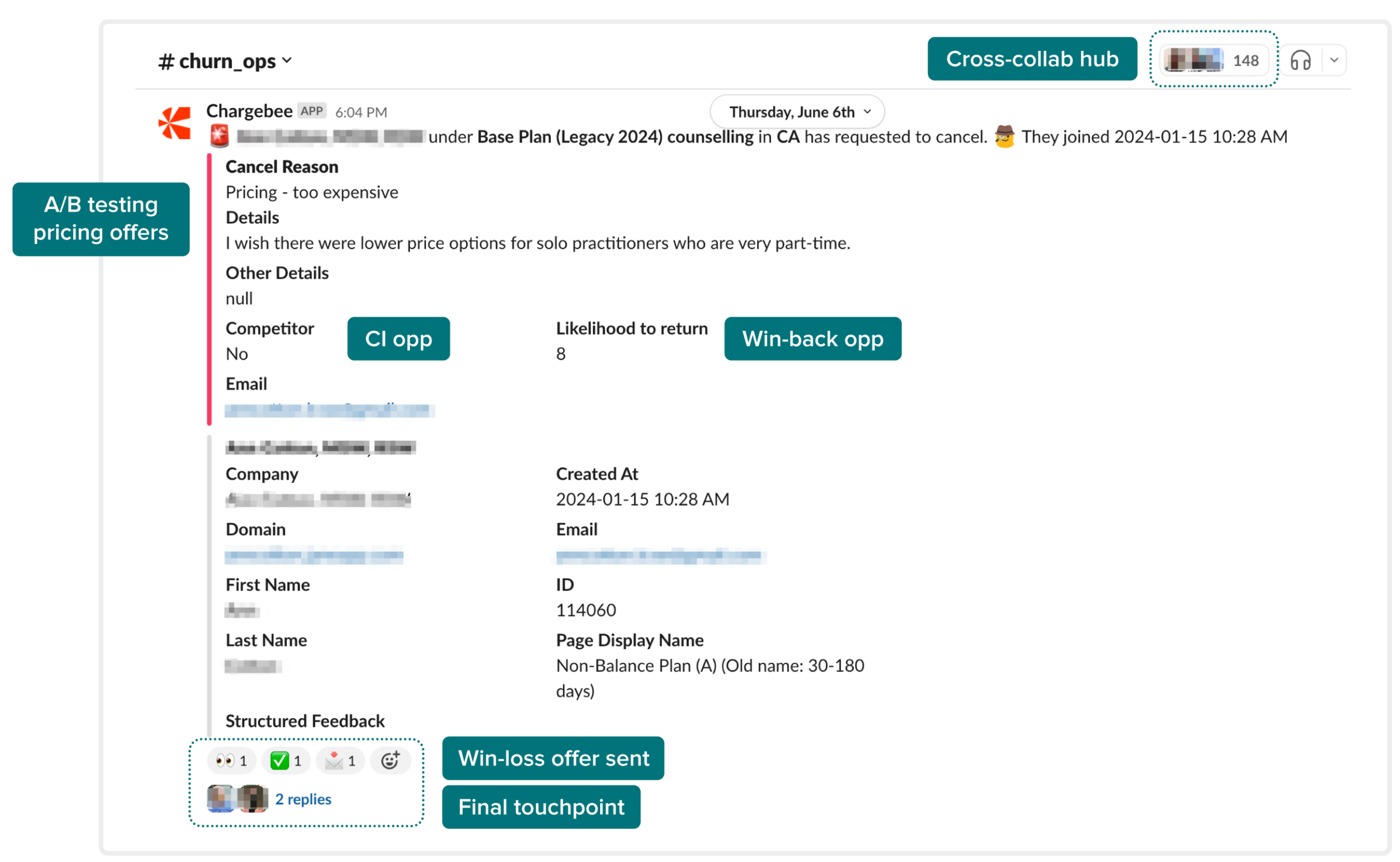 The Jane team created a Slack channel as a central hub for monitoring churn data using cancellation insights provided by customers via Chargebee Retention. This visibility into churn data enabled Jane to learn more about its customers, experiment with retention offers that would be more meaningful for them, and understand areas of the product that required more attention. Each department could now use specific churn feedback to drive its initiatives, including product development, onboarding improvements, or competitive analysis. The entire organization benefits from customer feedback.