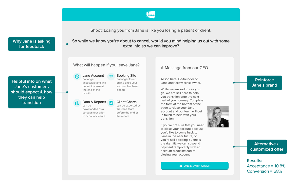 Beyond the numbers, Jane also focuses on creating a positive final touchpoint with customers, even if they leave for unavoidable reasons. Michelle talks about celebrating milestones with their customers, “We want to celebrate the big moment in their lives, even if that means they’re leaving us. So if someone is canceling their account to take a paternity leave, we might send a Jane-branded baby onesie, or if they’re retiring, congratulation flowers.” Jane has seen how building a strong sense of community through small moments benefits their customers, products, and business.