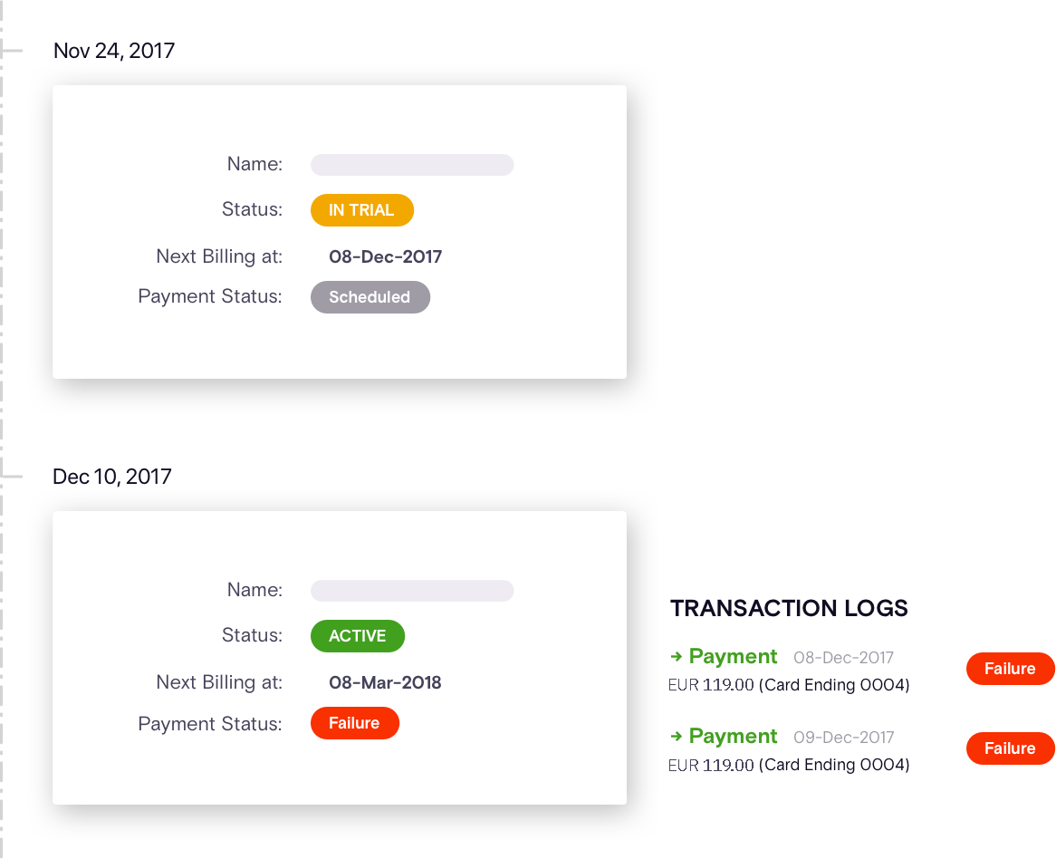 - Änderungen am AbonnementstatusVom Testangebot zur Aktivierung, von Verlängerungen bis zu Kündigungen – Sie können testen, ob sich der Abonnementstatus im Laufe der Zeit korrekt ändert.