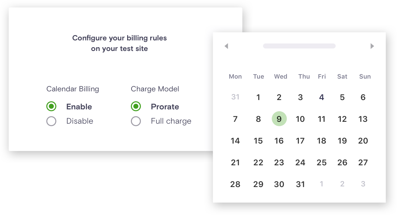 Sie möchten Ihren Kunden am 9. eines jeden Monats eine Rechnung senden, unabhängig davon, wann sie sich registriert haben. Haben Sie Bedenken wegen einer möglichen doppelten oder anteilsmäßigen Verrechnung? Mit uns können Sie Ihre Konfiguration in Sekundenschnelle testen.