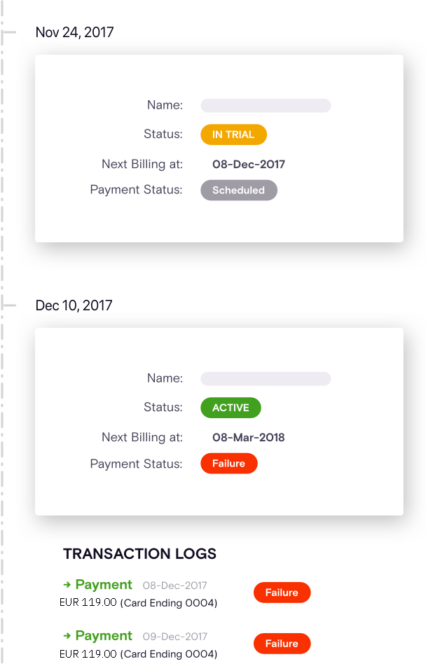 - Änderungen am AbonnementstatusVom Testangebot zur Aktivierung, von Verlängerungen bis zu Kündigungen – Sie können testen, ob sich der Abonnementstatus im Laufe der Zeit korrekt ändert.