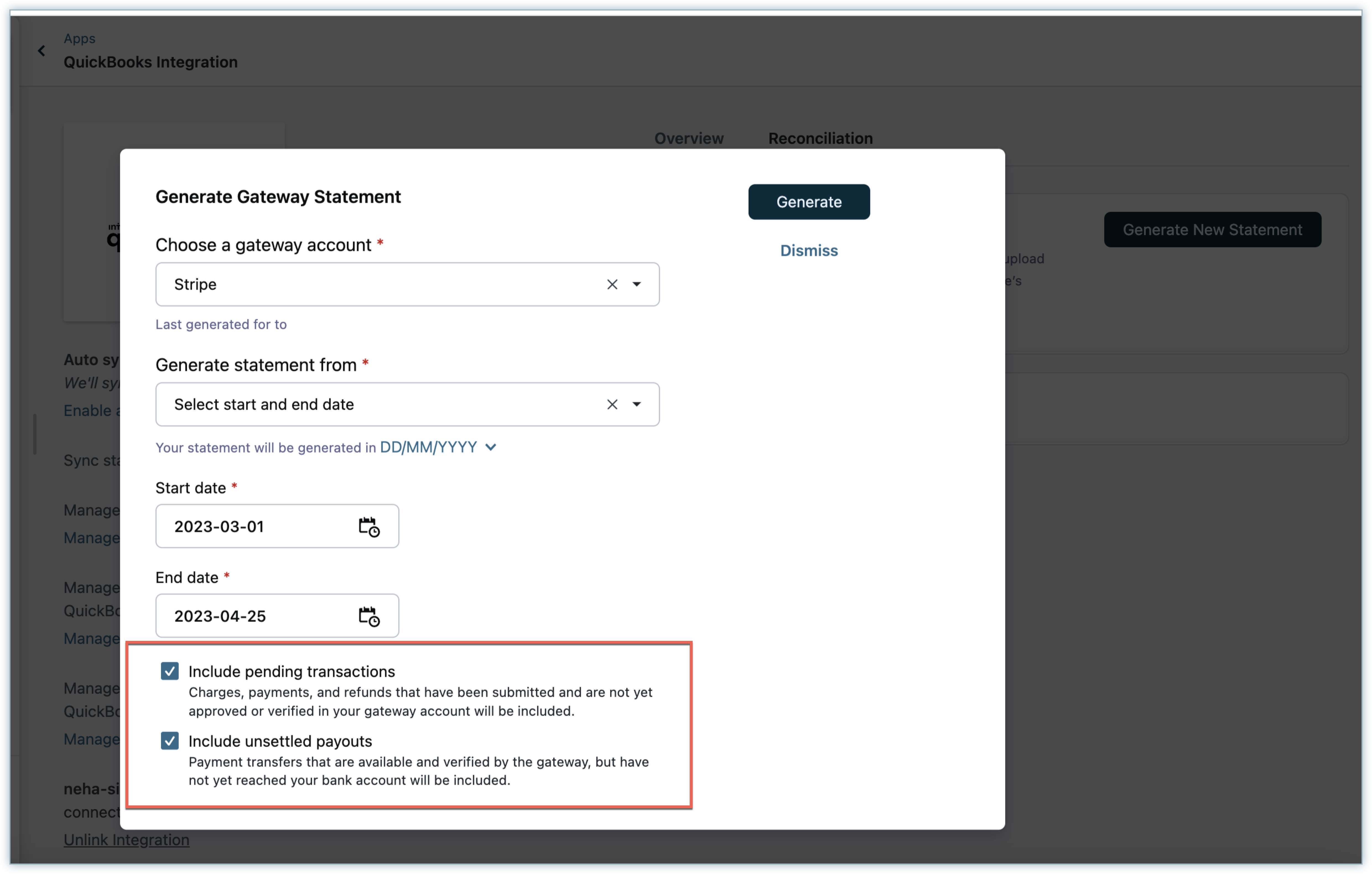 Click Generate to generate a new gateway statement for the selected date range. Once the statement is generated, you can download the statement and upload it to your QuickBooks account.