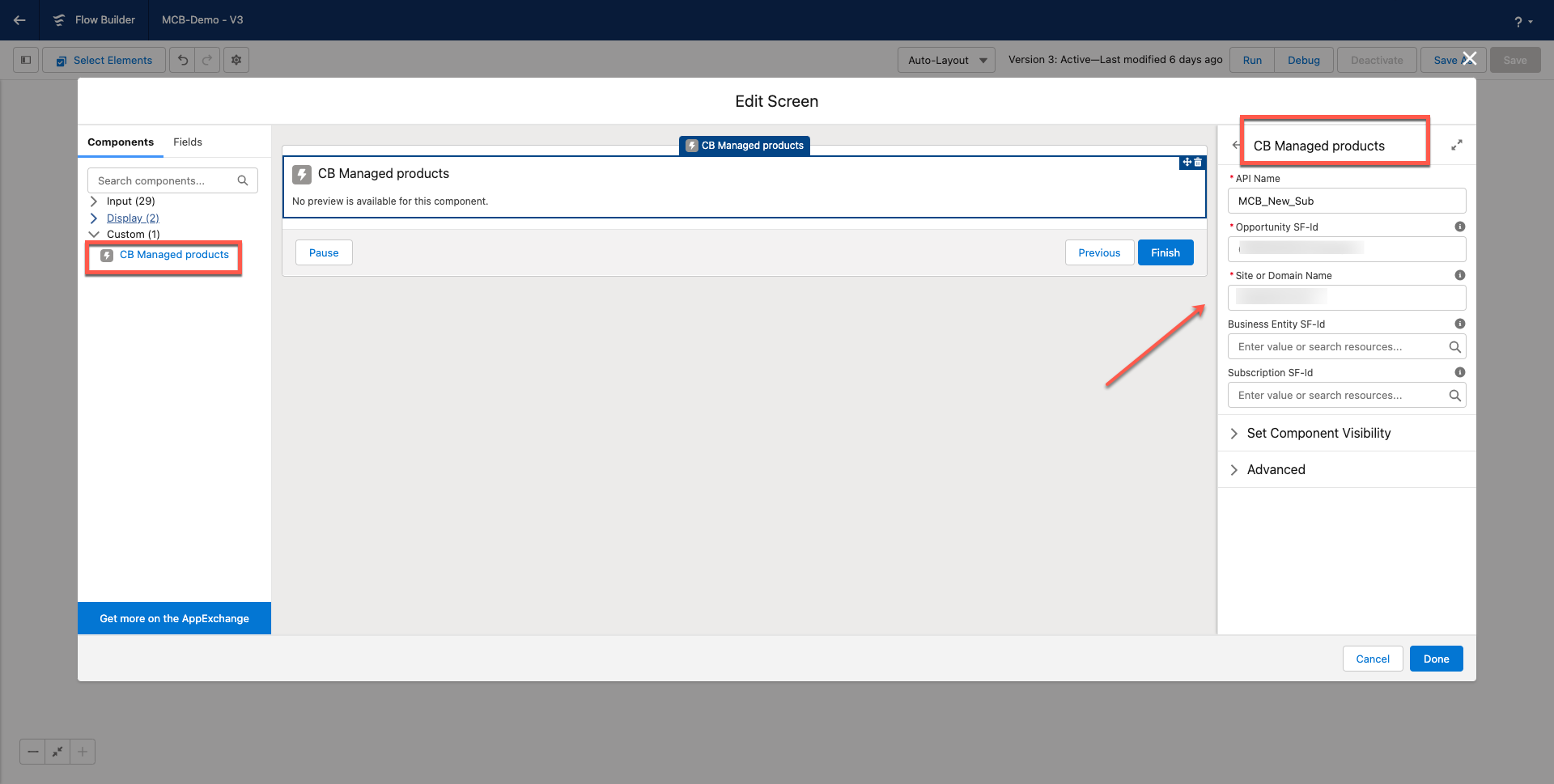 Components can be added while creating screens for the flow or you can also add components to the CB Managed Products by clicking Custom > Add attribute details like Opportunity Id, and Site or Domain Name in the right pane. Click Done.