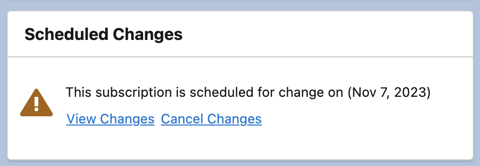 Click Change Subscription. At the top of the page, a notification about the scheduled change appears.