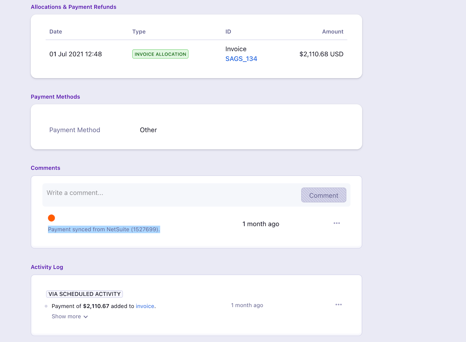 **If you see that the offline payments are not synced to Chargebee in spite of this feature being enabled, then the possible reasons are listed below.**A. Only the offline payments that you record manually against each invoice in NetSuite will sync back to Chargebee.
