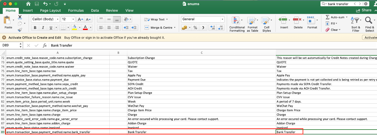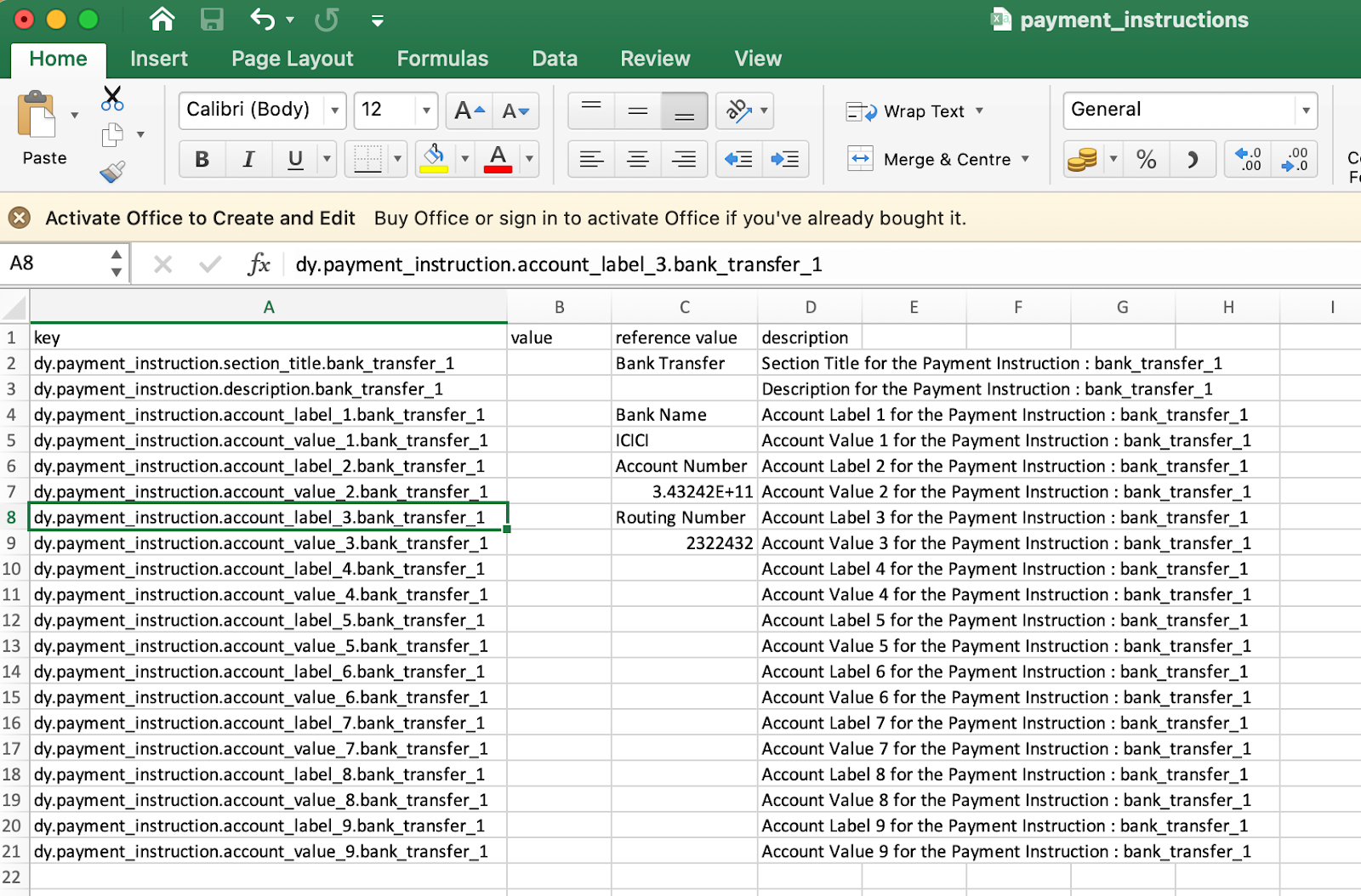 Open the CSV file in an editable format and change the relevant field or text you want to edit by adding the updated information in the 'Value' column. Example: If you want to display 'Bank Name Details' instead of 'Bank Name', then add 'Bank Name details' in the 'Value' column