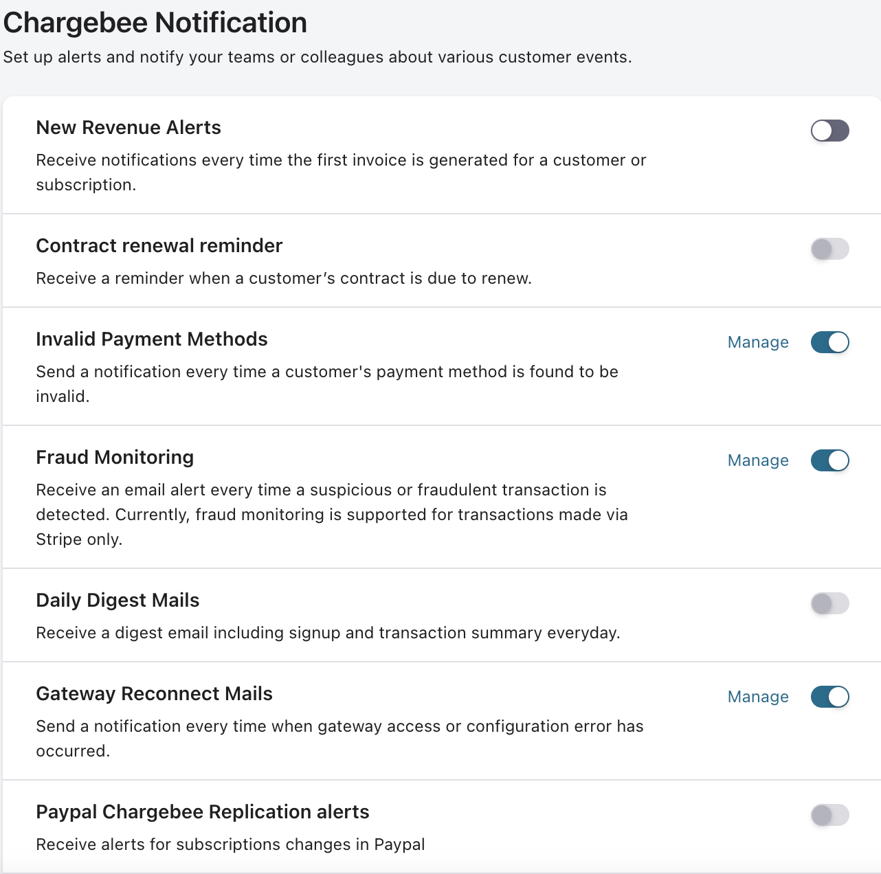 • Chargeback Automation Failure Alerts: When intervention is required to perform operations on invoices and subscriptions under chargeback.