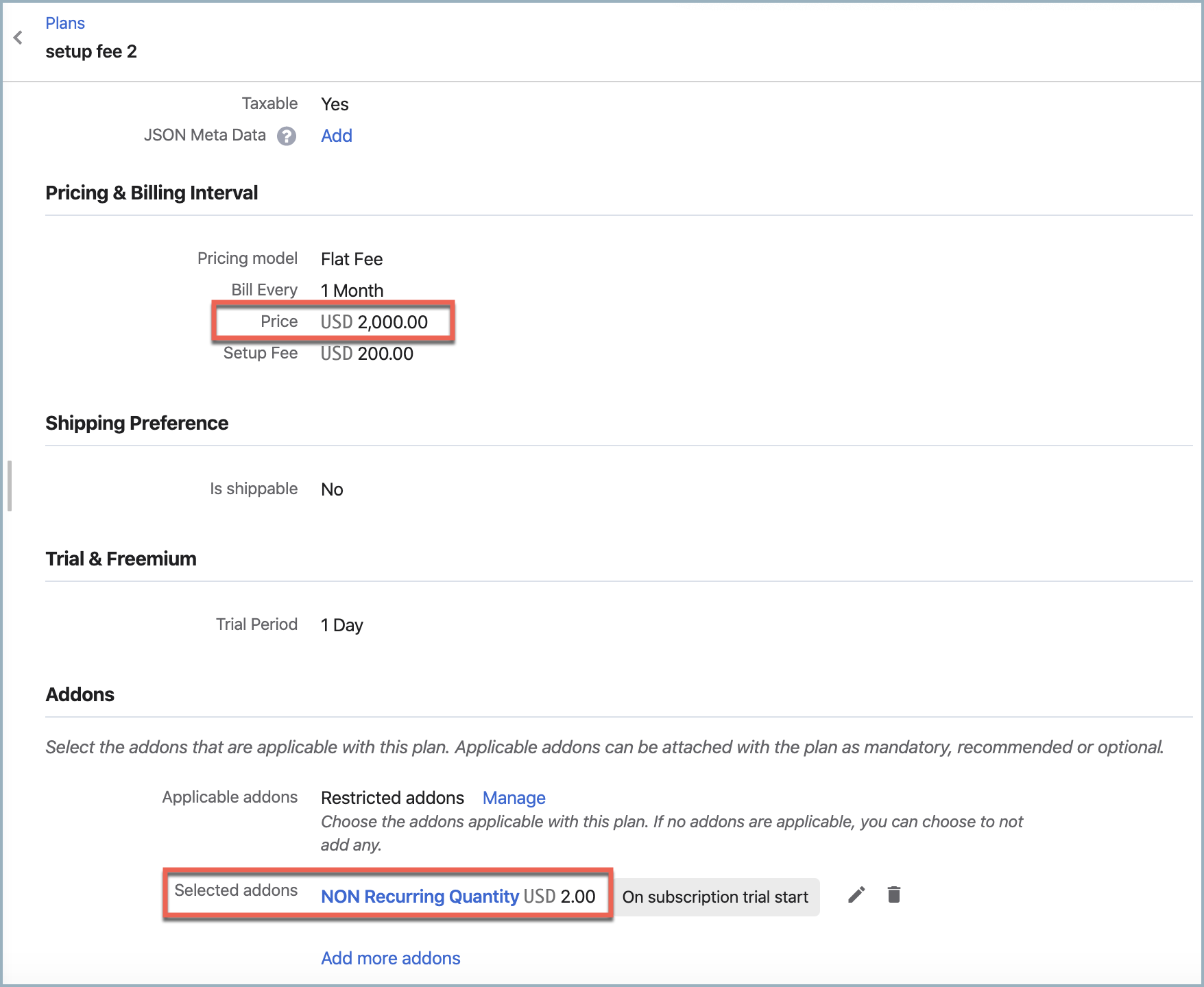 By default, Chargebee collects the setup and subscription fees only on subscription activation. If you'd like to collect the setup fee for a trial, you can use the Auto Addon option. The Auto Addon option allows you to group addons with a plan so that the addons are automatically added to a subscription when the plan is selected.