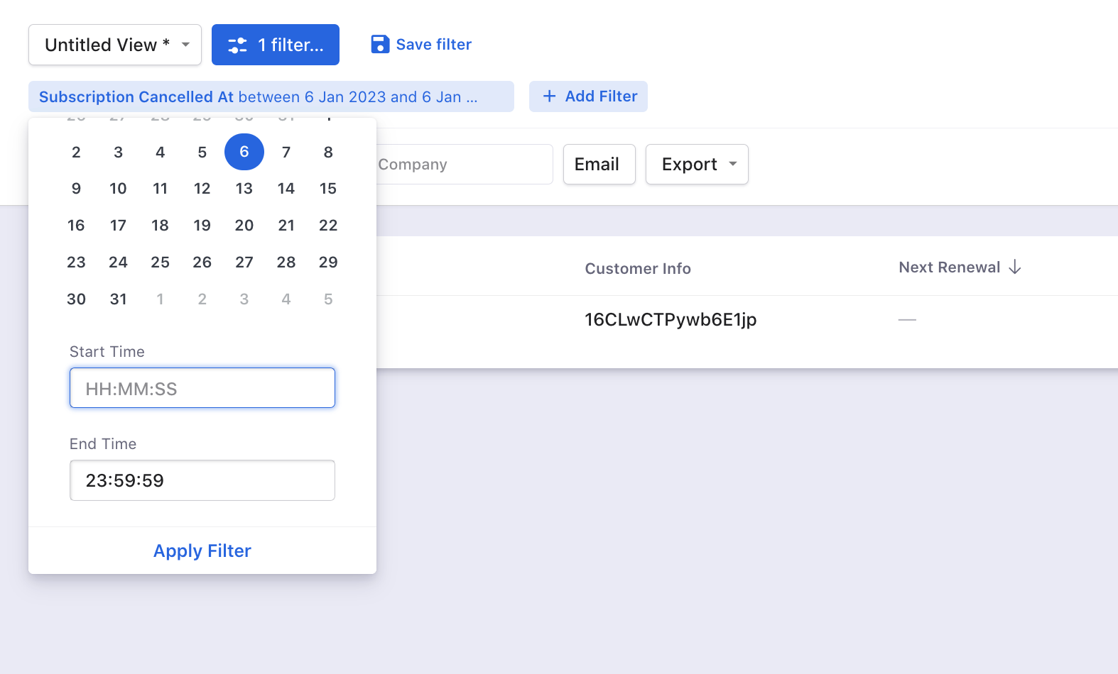 However, to extract similar reports for one specific date, go to that specific page -> Add Filter -> Cancelled At (Example) -> Between -> That date (Example: Jan 6th) to Jan 6th but here you need to give the time as 23:59:59 -> Click Apply Filter.