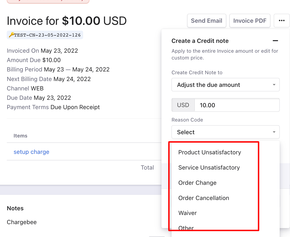 Chargebee allows you to use the default reason codes as well as add custom reason codes. The default reason codes for a credit note are as mentioned in the below image.