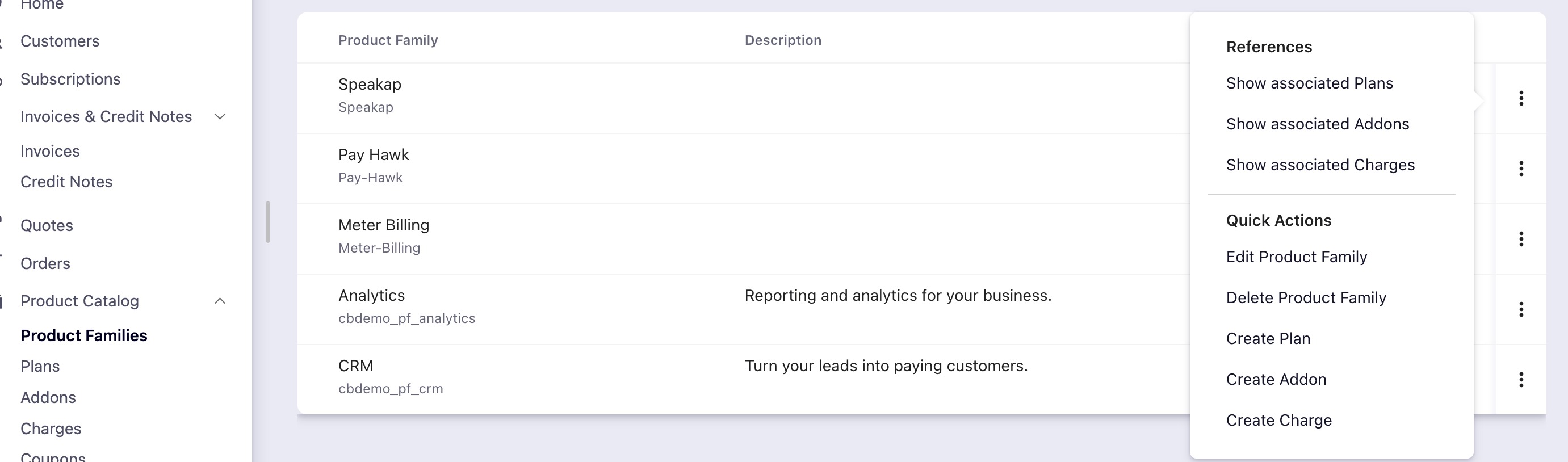 Chargebee allows you to navigate to the Plans, Addons & Charges list page associated with the Product family with a single click.