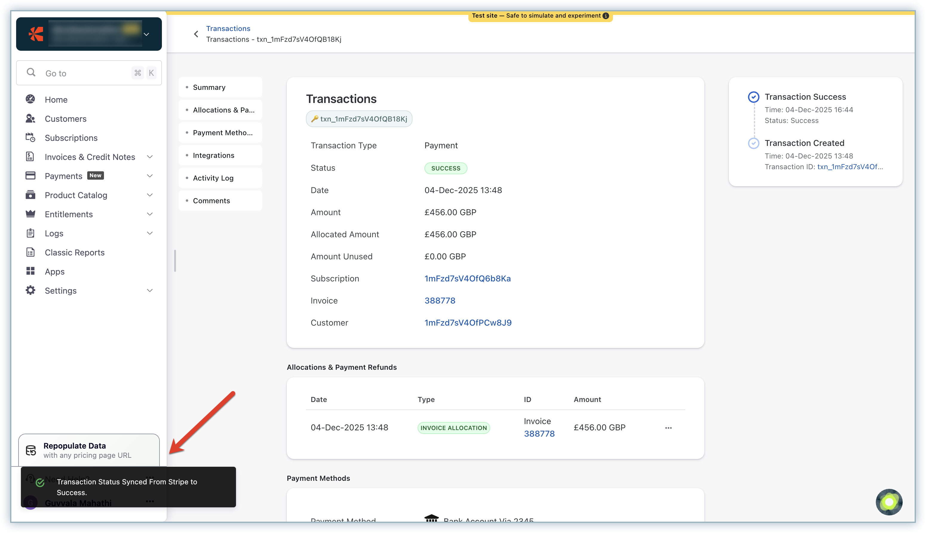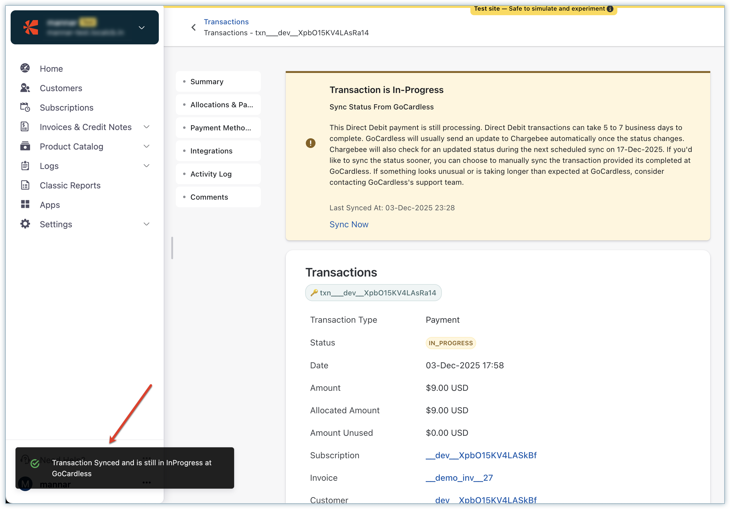 Sometimes, a payment may remain in the In-Progress state longer than expected due to gateway issues or notification delays. To help you resolve these transactions more quickly, Chargebee offers a manual sync option that allows you to fetch the latest status directly from the payment gateway.