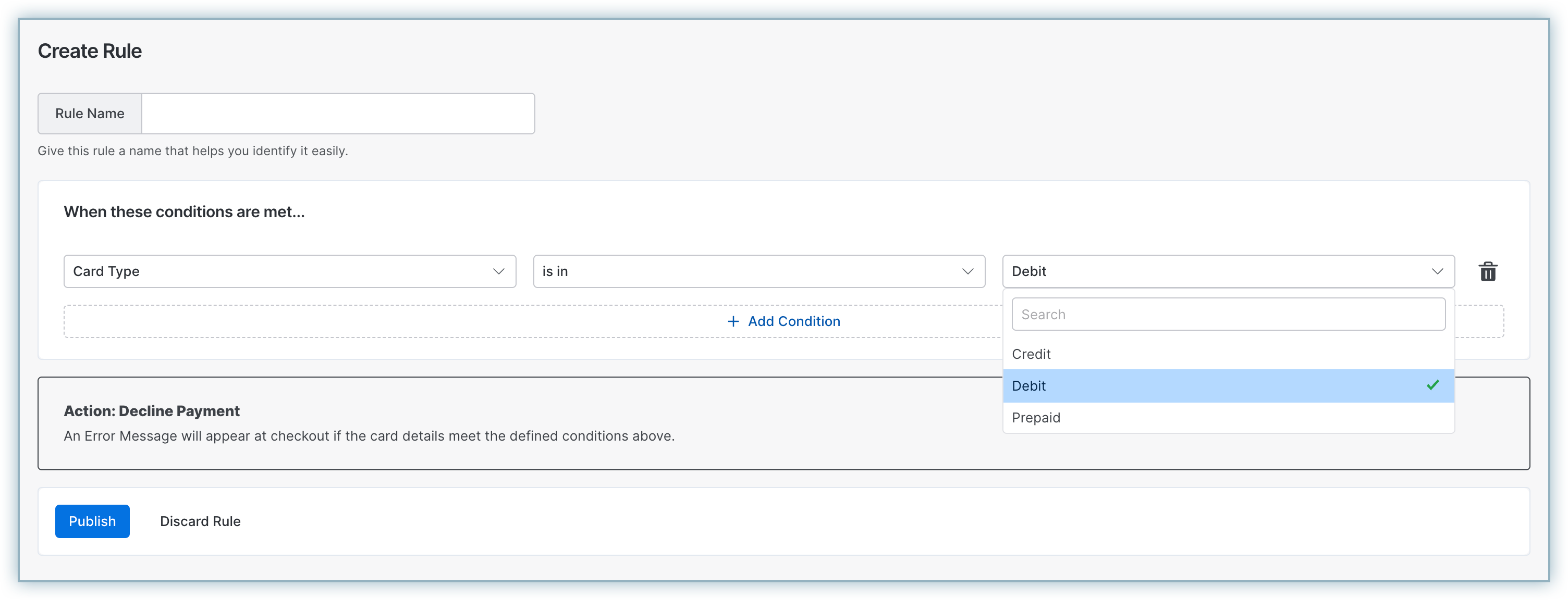 "If the card brand is AMEX and the card issuing country is Curacao, then decline the payment."