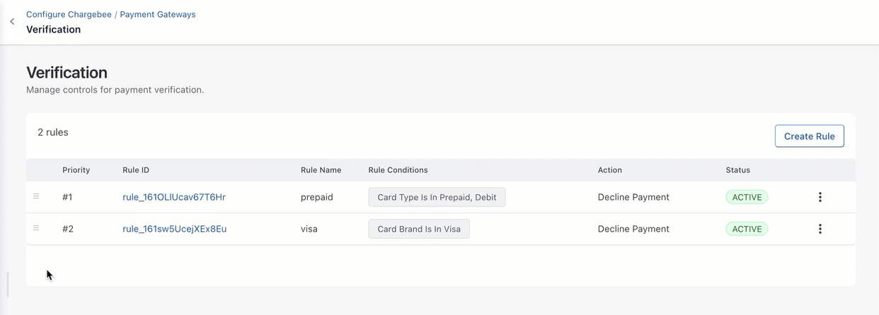 Verification Controls provide a centralized way to manage payment flows within Chargebee, independent of any payment gateway. They help optimize your payment workflow by allowing you to filter out specific card payment methods that may not be ideal for recurring transactions or reject high-cost card types before they reach the payment gateway. By enforcing these verifications at the Chargebee level, you can prevent unnecessary processing costs.