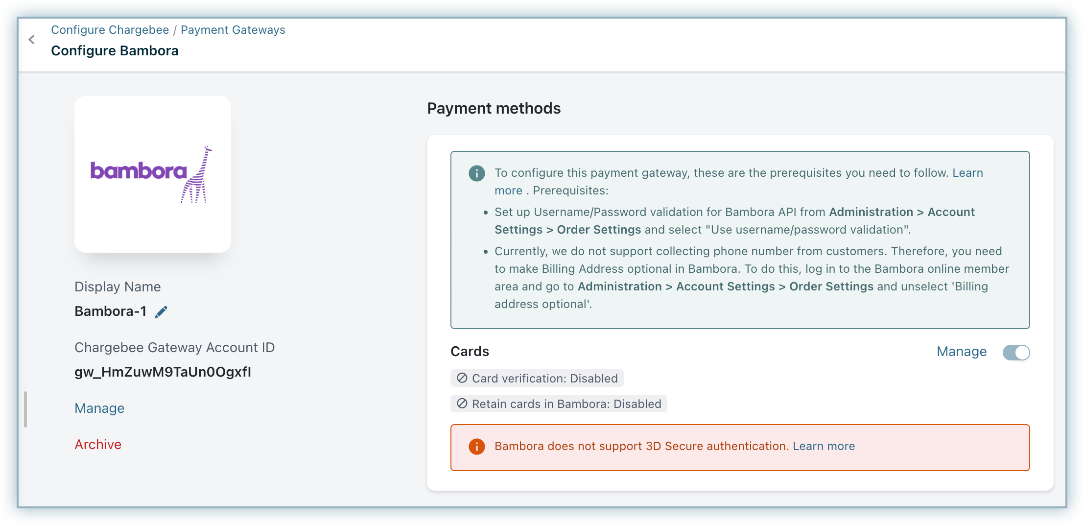 1. Chargebee uses Spreedly, a third-party card vault, to store the customer's card information. If you are using Bambora's service, you must migrate your customer's card information to Spreedly to start using Bambora with Chargebee. Contact support for more information about the migration process.