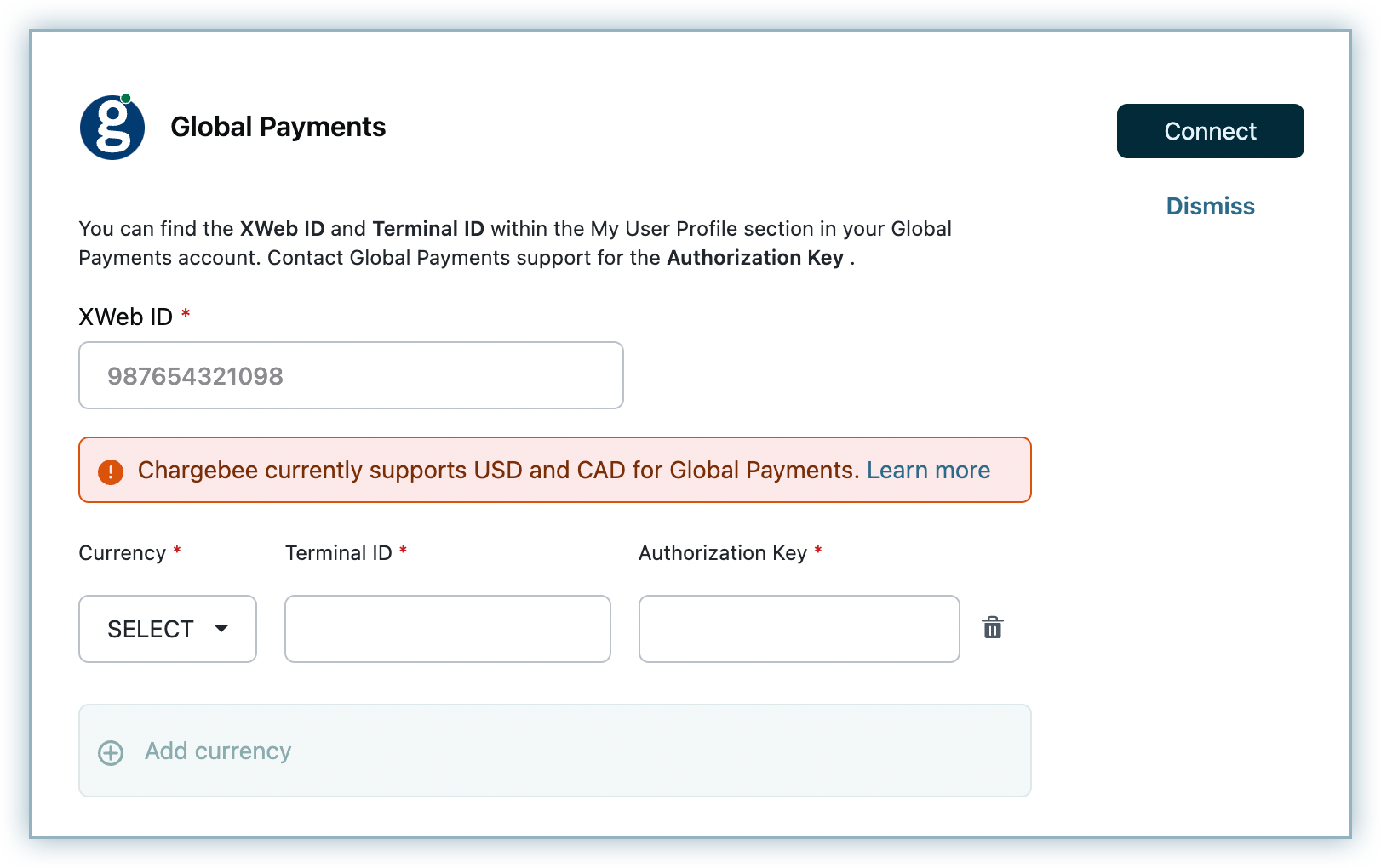 The following options are available to integrate your Global Payments gateway with Chargebee: