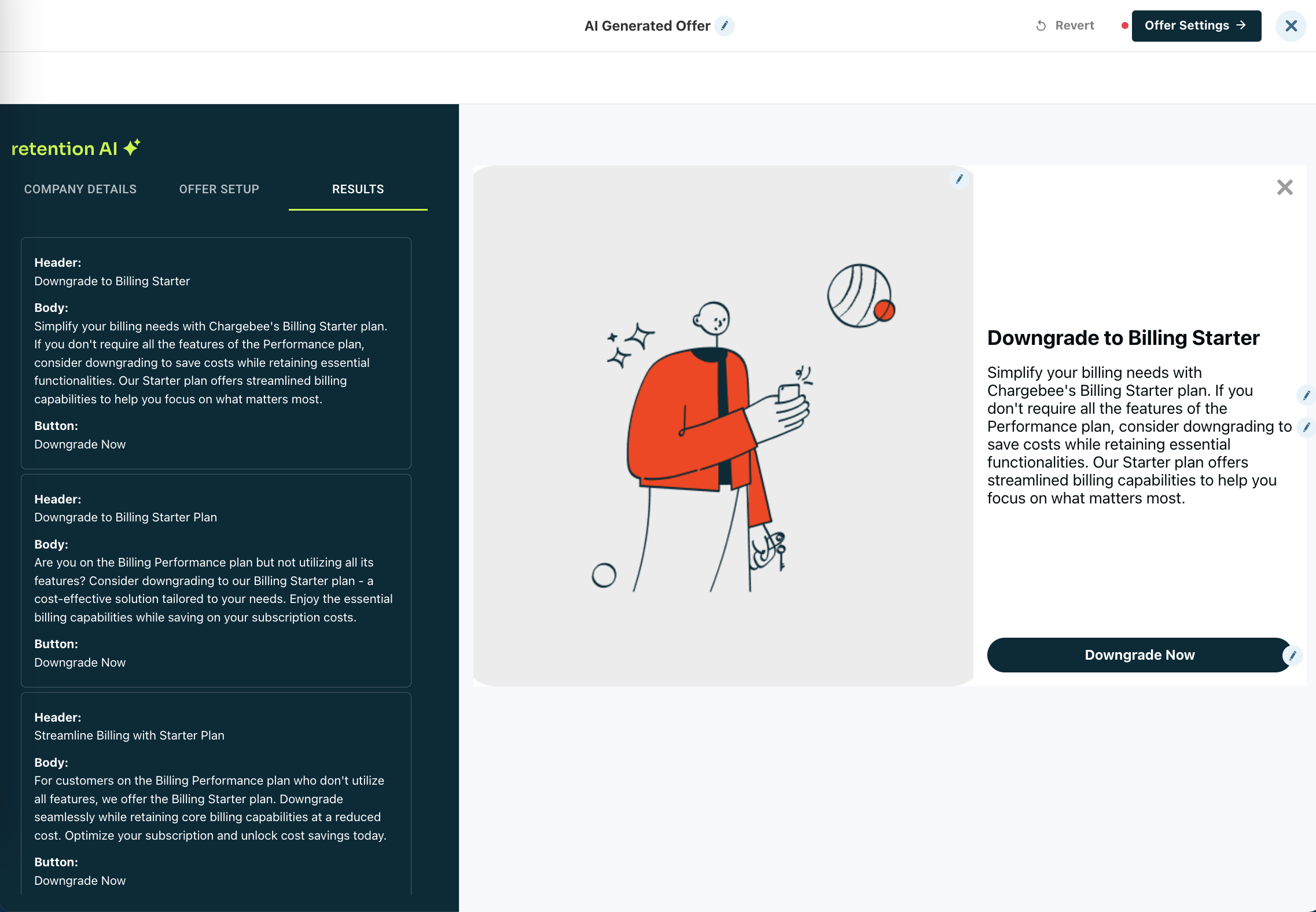 Chargebee Retention helps merchants reduce churn by presenting the right offer to the right customer at the right time. However, crafting the right offer can be a time consuming process and merchants may not know the right offer content to maximize offer performance.