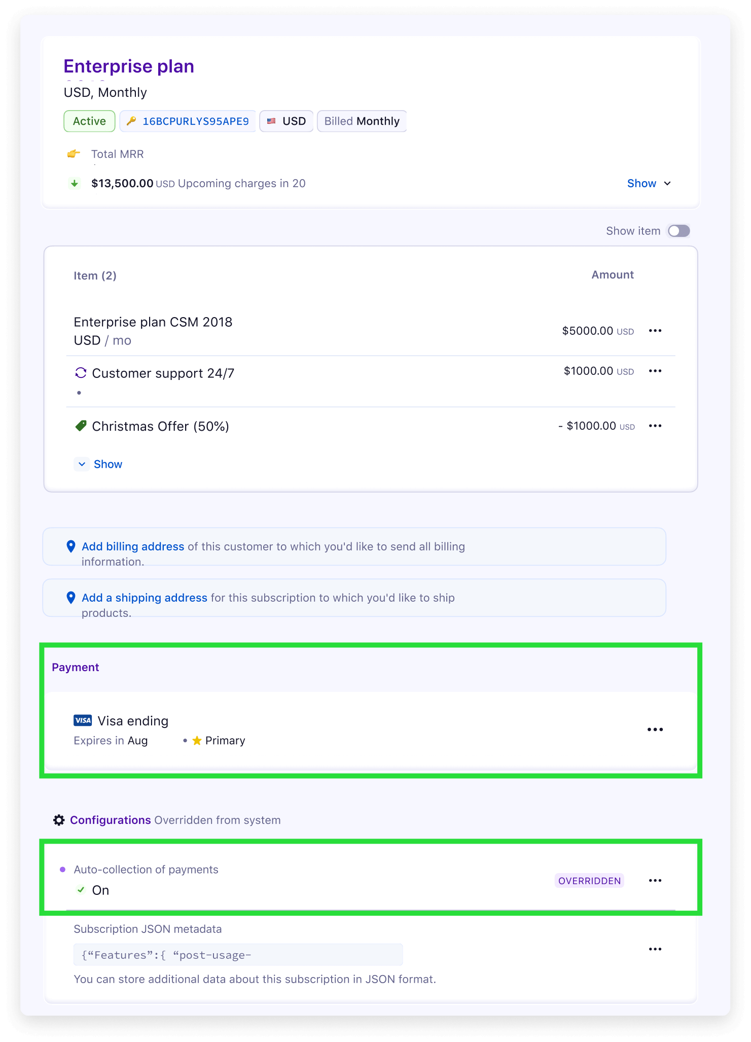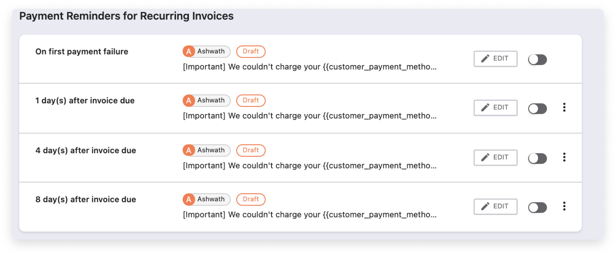 Automate recurring payment collections, no matter what the frequency of the subscription is. No more chasing payments renewal cycle! But please note that this works only if there's at least one active card added to the subscription.