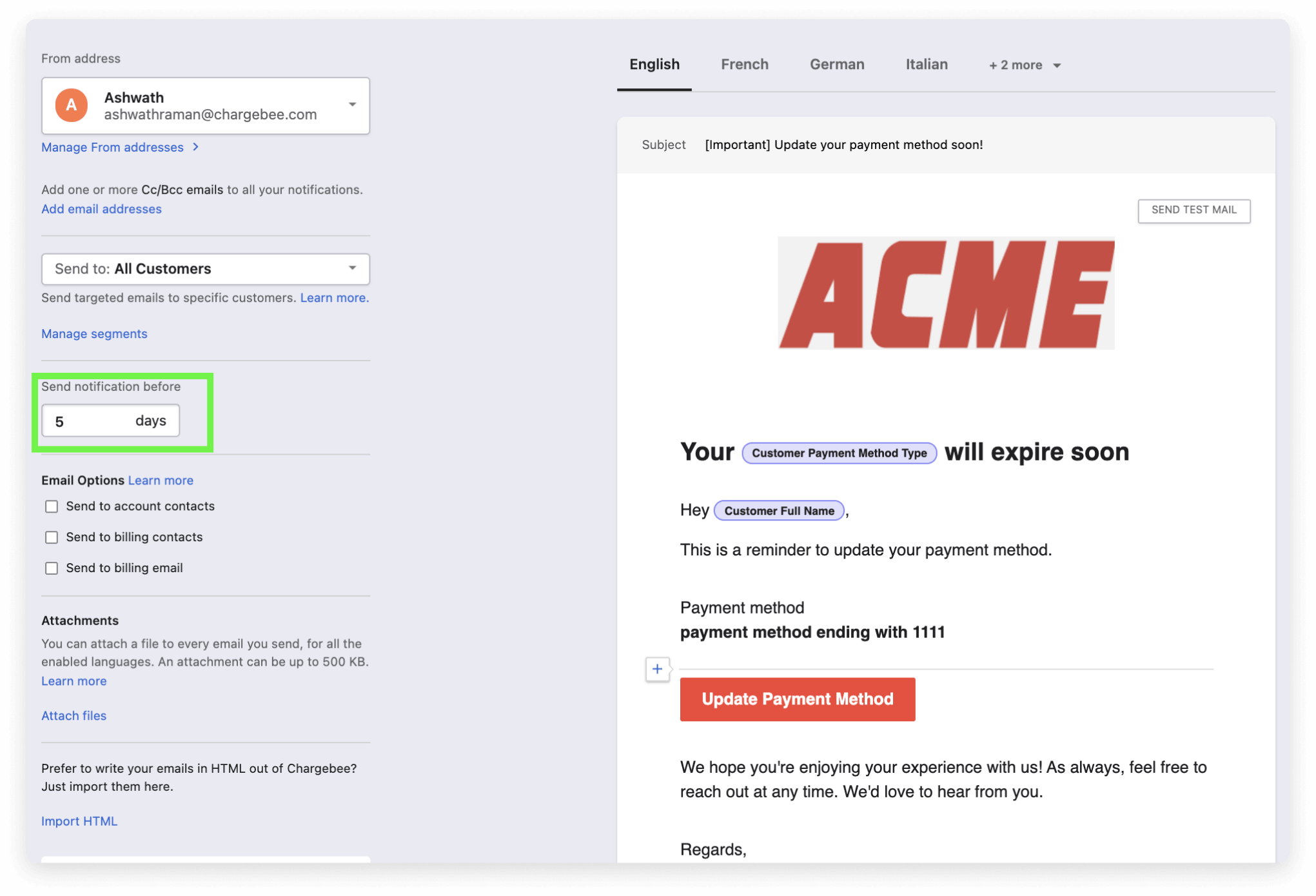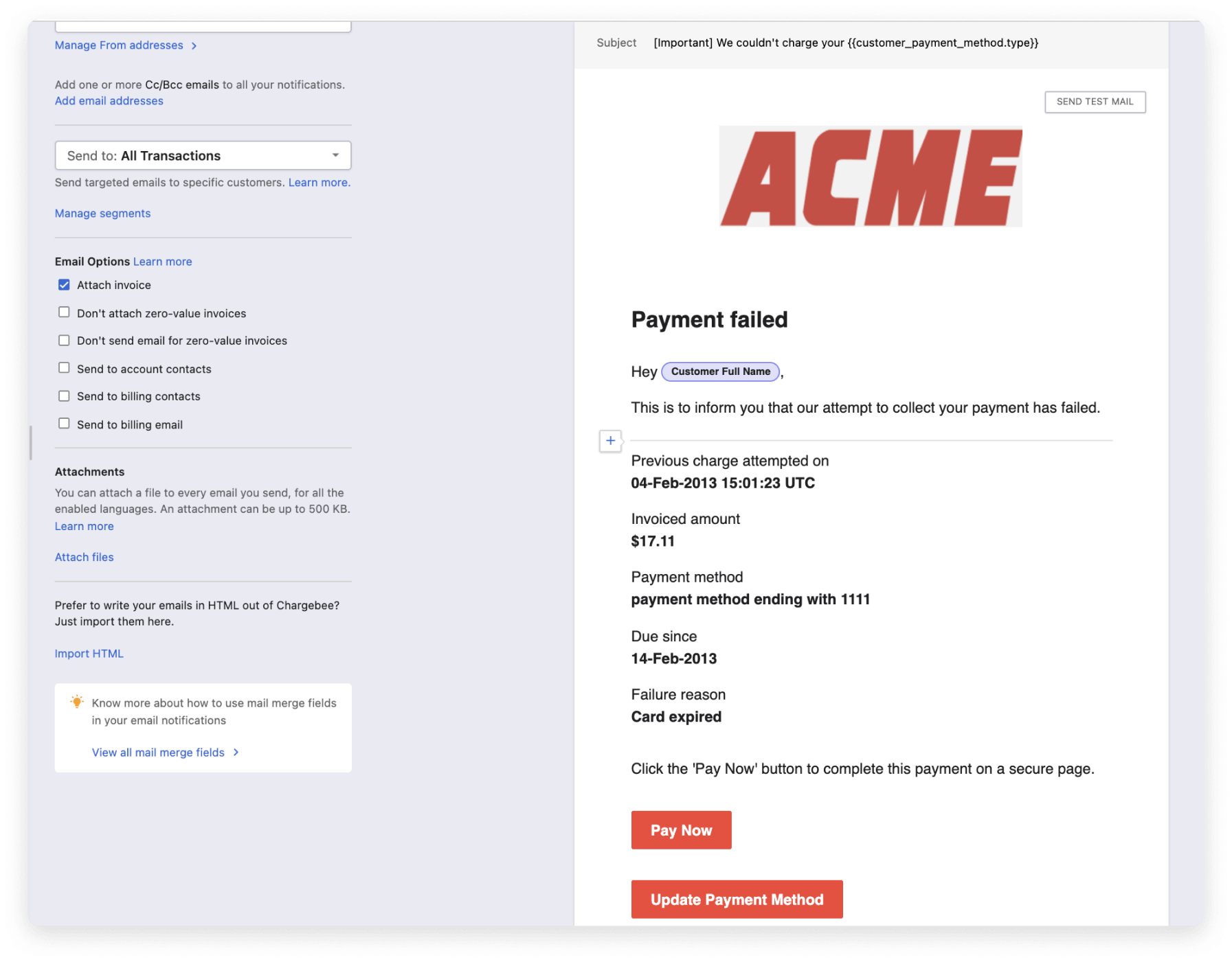 Your customers get many invoices per month, they're not expected to remember if their credit card is expiring soon. Remind them to update their soon-to-be expired cards well in advance with configurable event-based email reminders, so you can continue to collect payment seamlessly.
