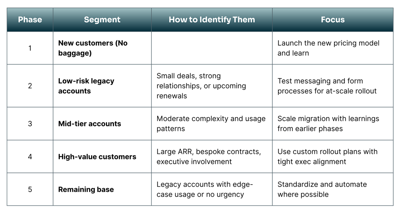 Rolling out your new pricing model with net-new customers lets you learn without the risk. There are no expectations to reset, and every closed deal builds internal muscle, providing your team with real data, tested talk tracks, and the confidence to engage with legacy customers later.