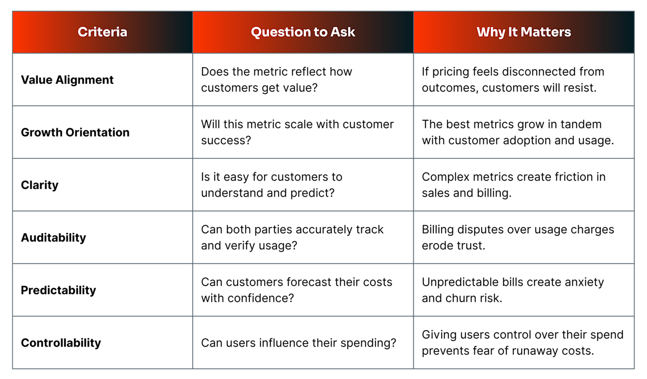 Choose metrics that are visible to customers and align with their perception of value. Charge for documents processed rather than tokens consumed, or results delivered rather than queries executed. Focus on what makes your product or customer results distinct, rather than just general AI processing capabilities.