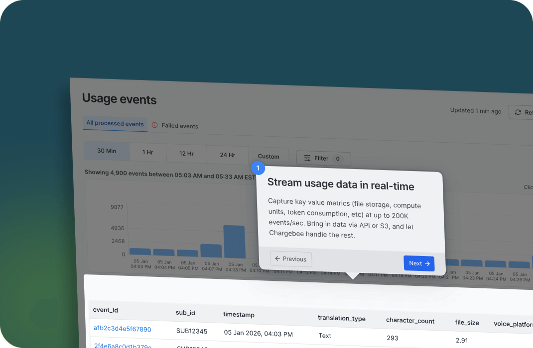 Bring your usage data, define your business logic, and Chargebee handles the rest — ingestion, rating, and billing at scale. Move from raw signals to billable value instantly.