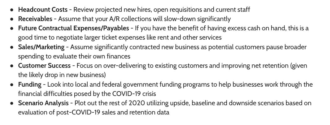 BM: During times like these, a scenario forecasting must be done with a weekly cadence. This is a great method because it'll help your business prepare for the future and be proactive, while you still have cash. In this process, you stress test your business. For instance, I run through worst-case assumptions. I keep my expense base the same and forecast by reducing booking revenue and increasing churn. This helps me analyze what these implications do to my company's margins and cash.