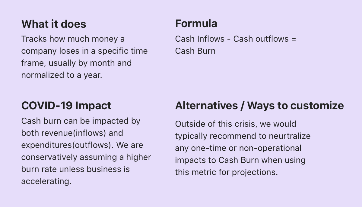 BM: Cash flow is measured as net cash flow and gross cash flow. It helps to analyze if you're burning cash or building cash. Cash flow is the major reason why many businesses fail during good and bad times. Hence, it's crucial to understand cash runaway. I like to look at cash burn like no invoicing was being done, in simpler terms, no cash is coming in.