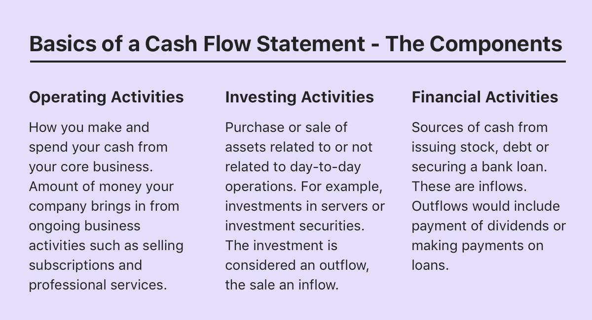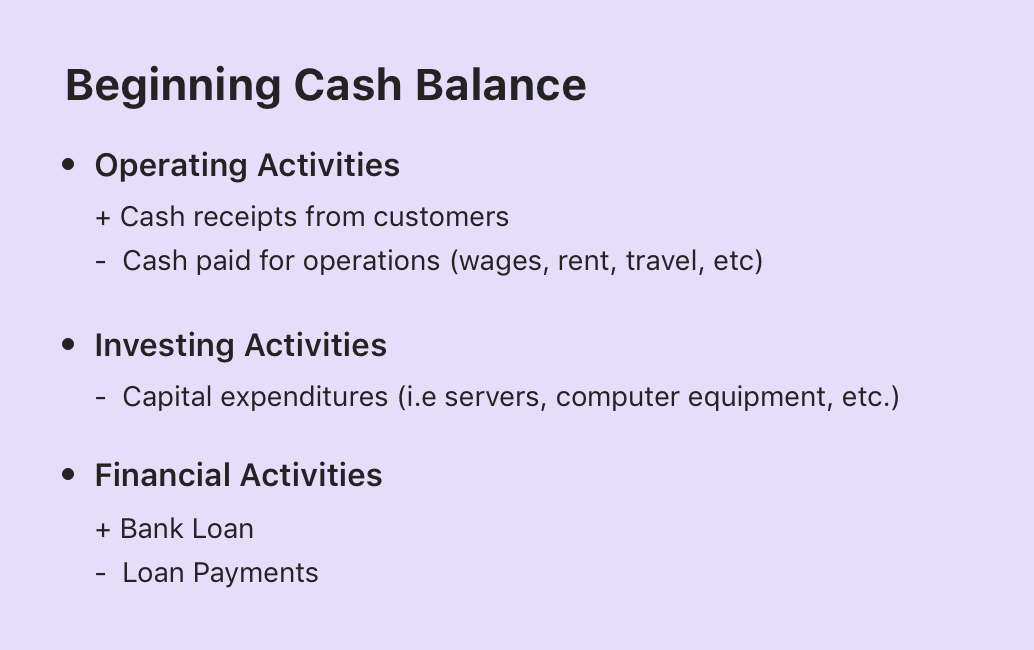 These areas are our core business activities and ties down to the invoices we're sending out to customers. The first is "operating activities", which covers the operating expenses such as wages, rent, etc., Then comes "investing activities". If you're investing in servers, internal R&D, etc., From the "financial activities" perspective, it could be cash coming in from loans, stocks, or just principal payments on our term loans.