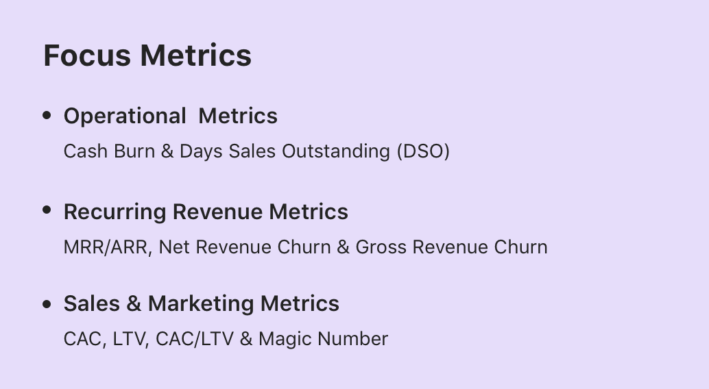 Your areas of focus should be your operational, recurring revenue and sales metrics.