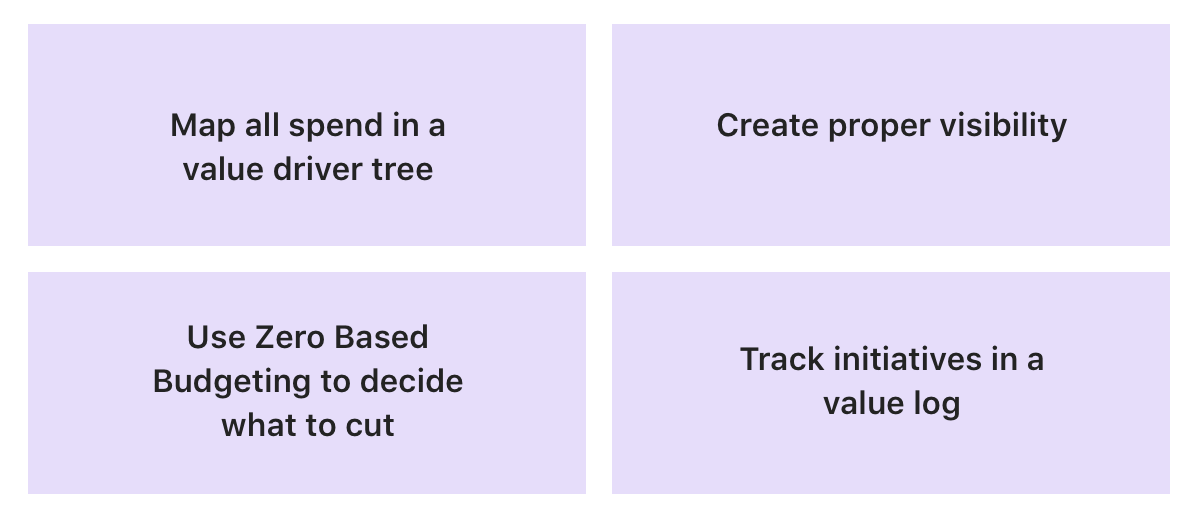 After having a clear picture of how value is created or destroyed in your company. It's time to pull out the big knife, clear the table and start from scratch. A good tool to build up a minimum viable budget is to use Zero Based Budgeting. There's no better time to truthfully answer the question "what do we really need to run our company".