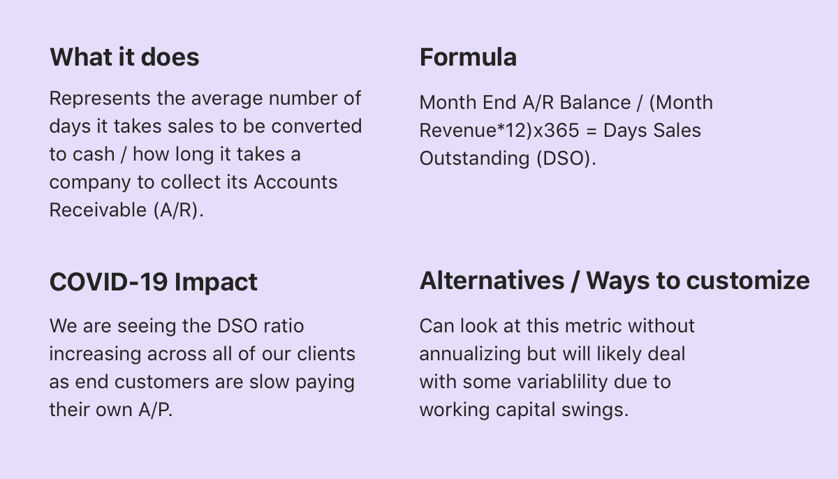 WC: Sales outstanding is basically calculating the time it takes for you to collect an invoice as it's sent out on average or what does that typically look like? The main reason why we focus on this metric is that it is one of the few things you can control. During these times, you can anticipate a slow down from a day sales outstanding standpoint.