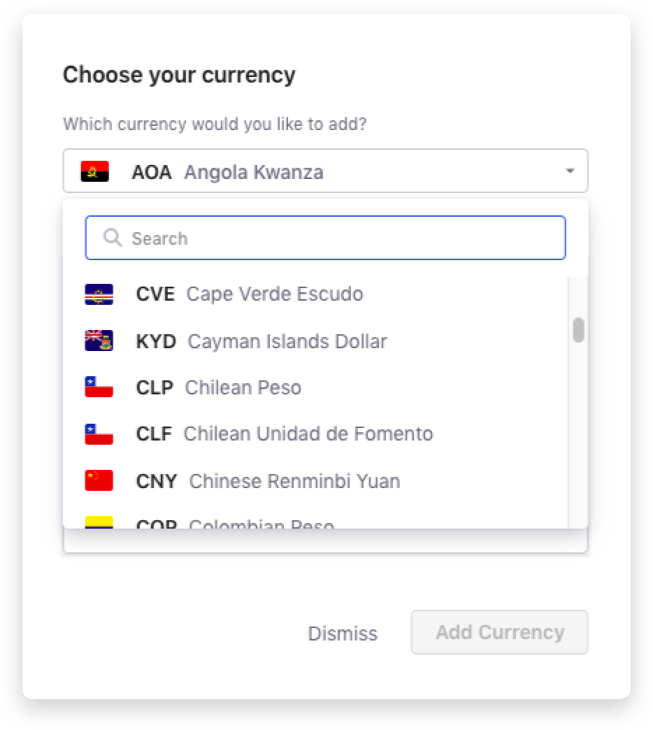 The additional currencies that you've set up will appear for selection when you create your Plans/Addons/Coupons.