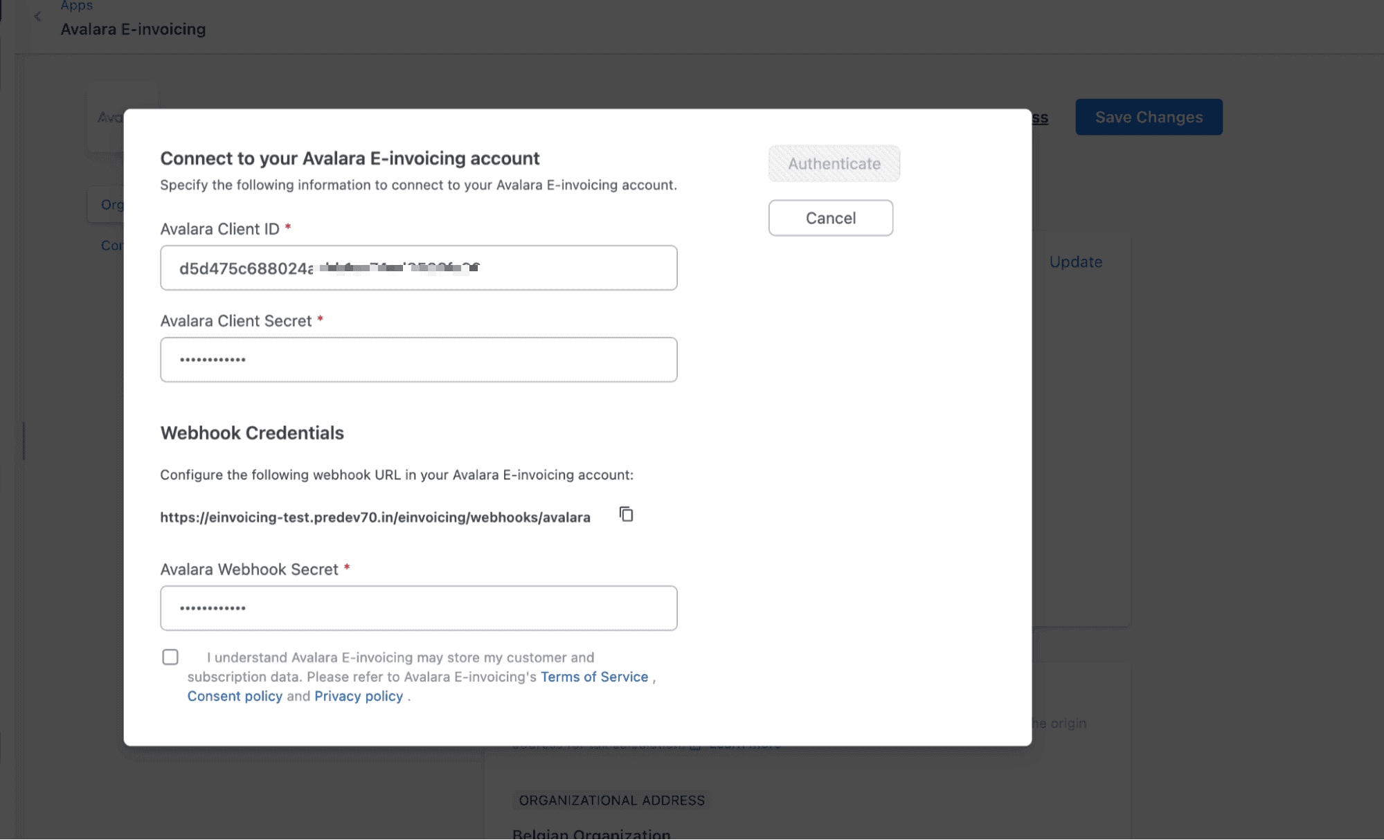Please check the checkbox to acknowledge that Avalara E-Invoicing may store the customer and subscription data before proceeding to click on the ‘Authenticate’ button.