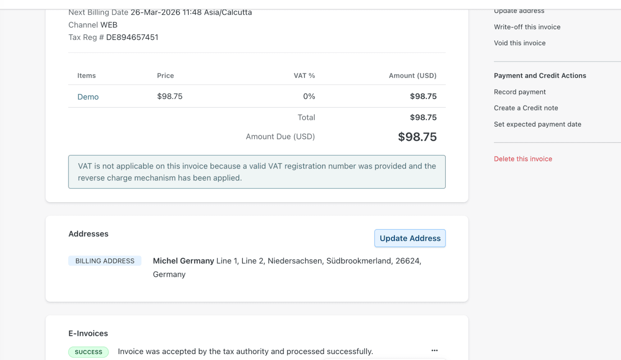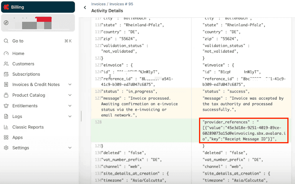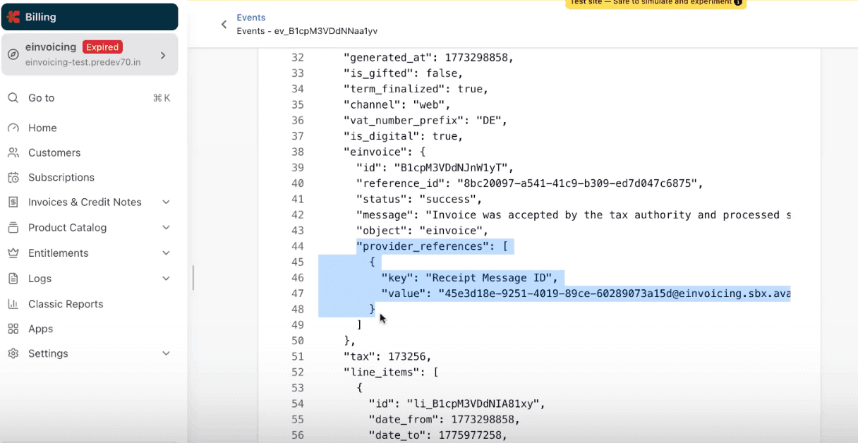 Chargebee leverages its existing Email Notification framework to attach the structured e-Invoice files once they have been successfully processed and returned by Avalara.