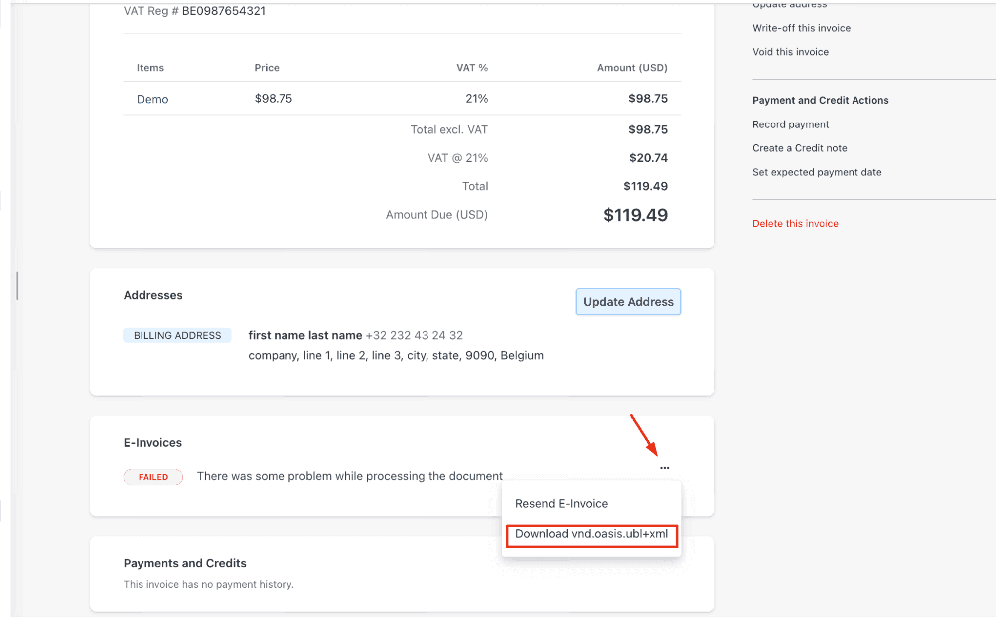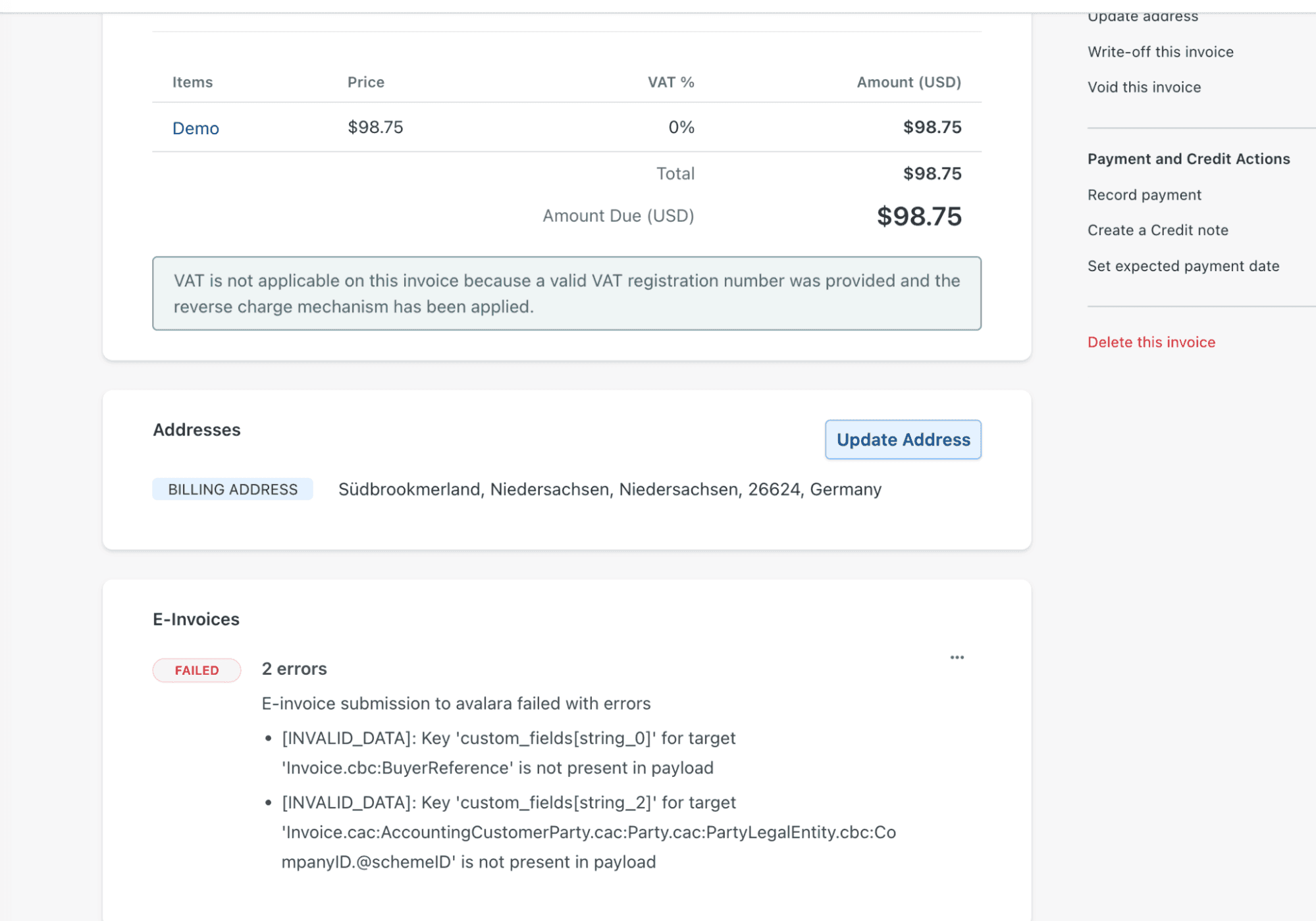 Failure details are visible within the E-Invoice card.