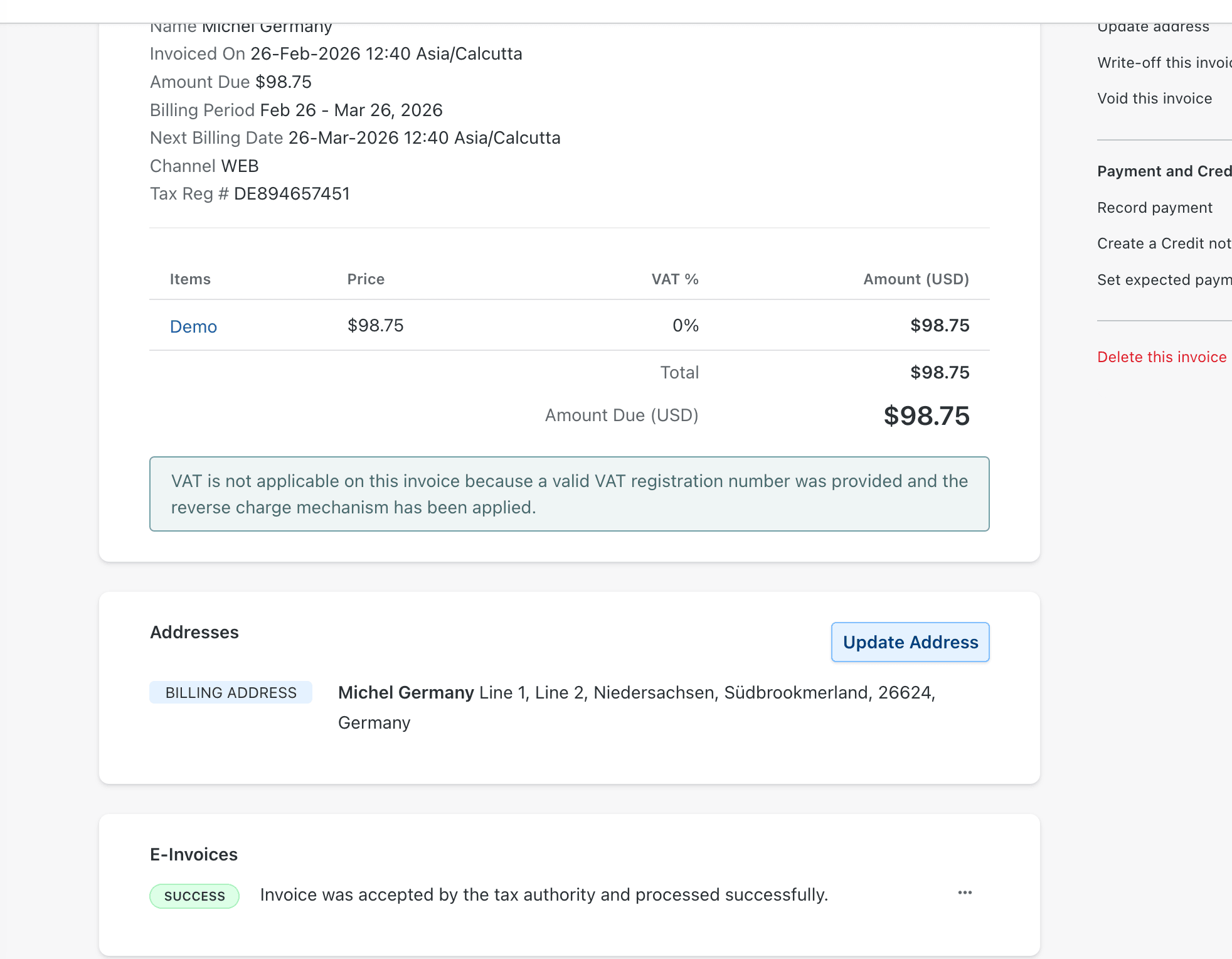 Settings → Configure Chargebee → E-Invoicing