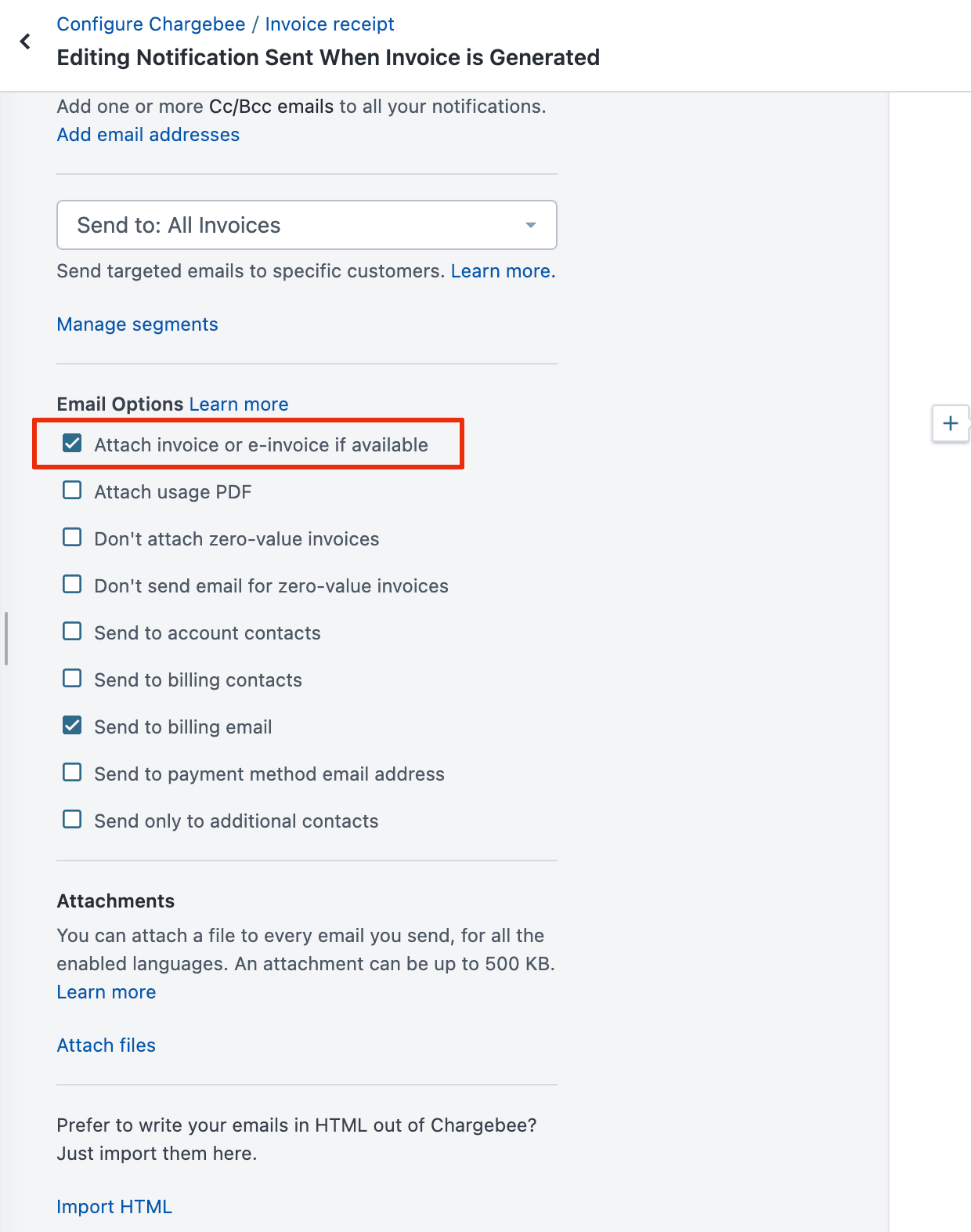 To configure this, navigate to the respective email notification, such as the Invoice Receipt notification, via Settings > Configure Chargebee > Email Notifications and ensure the setting ‘Attach invoice or e-Invoice if available’ is enabled:
