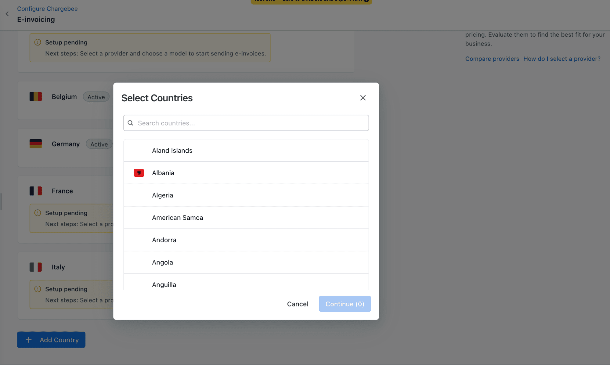 Click + Add Country to select jurisdictions where e-Invoicing is required.