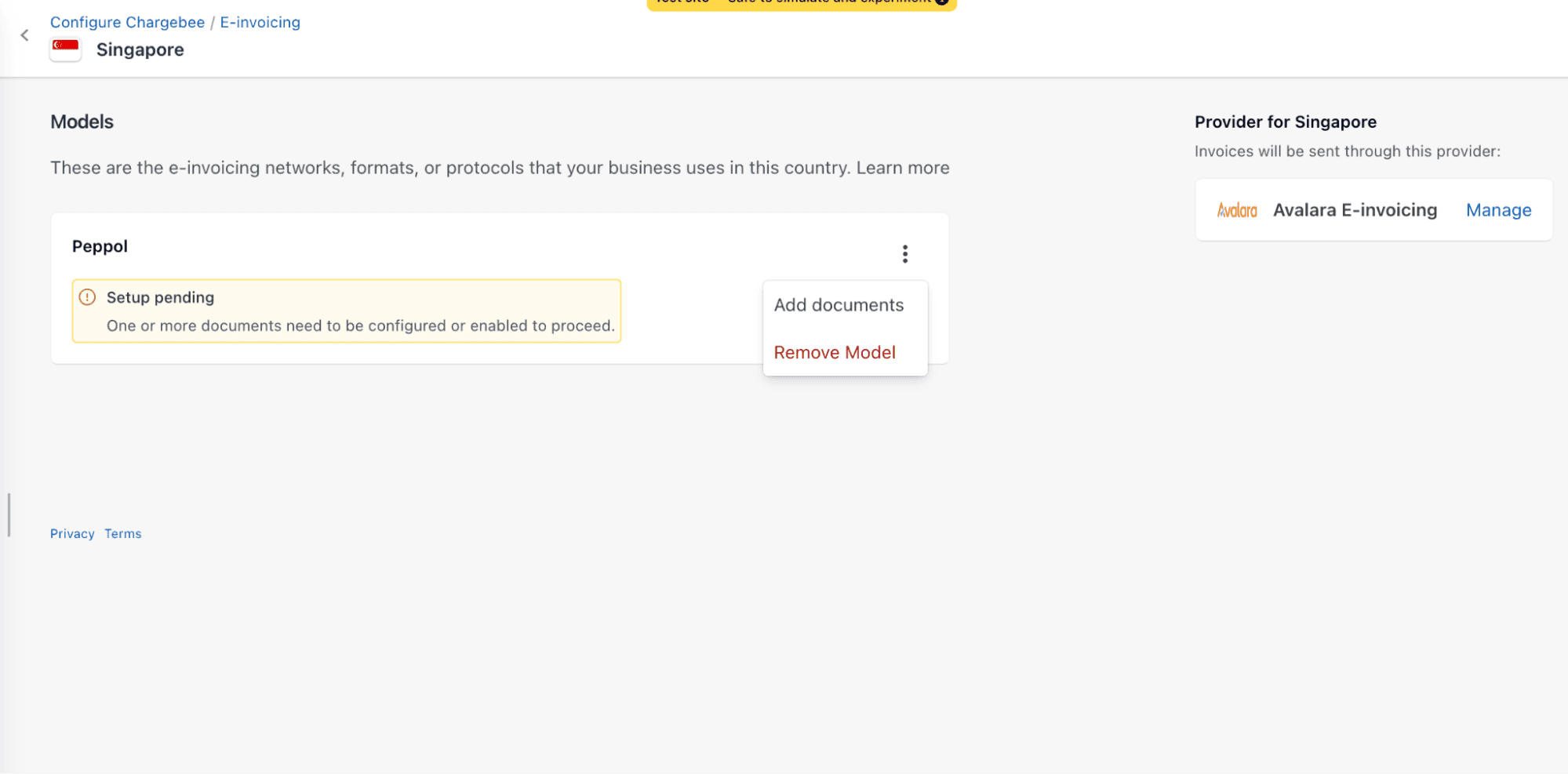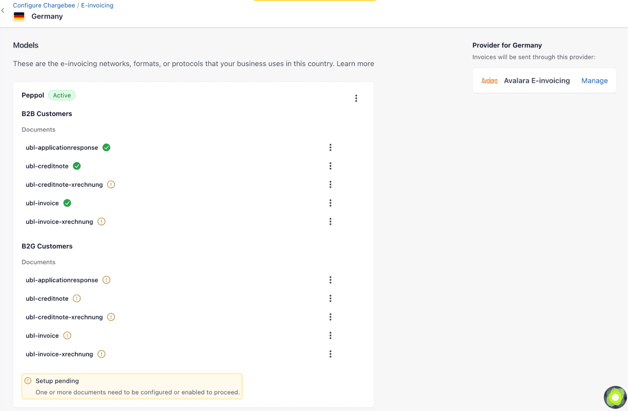 This section explains how to connect your Avalara ELR account to Chargebee and configure outbound e-Invoicing workflows for invoices and credit notes.