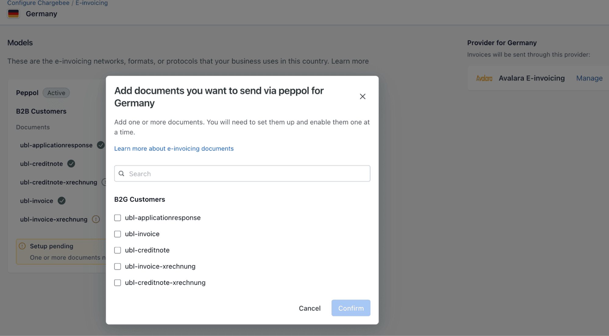 Chargebee can fetch supported mandates, document formats, and Company IDs from Avalara.